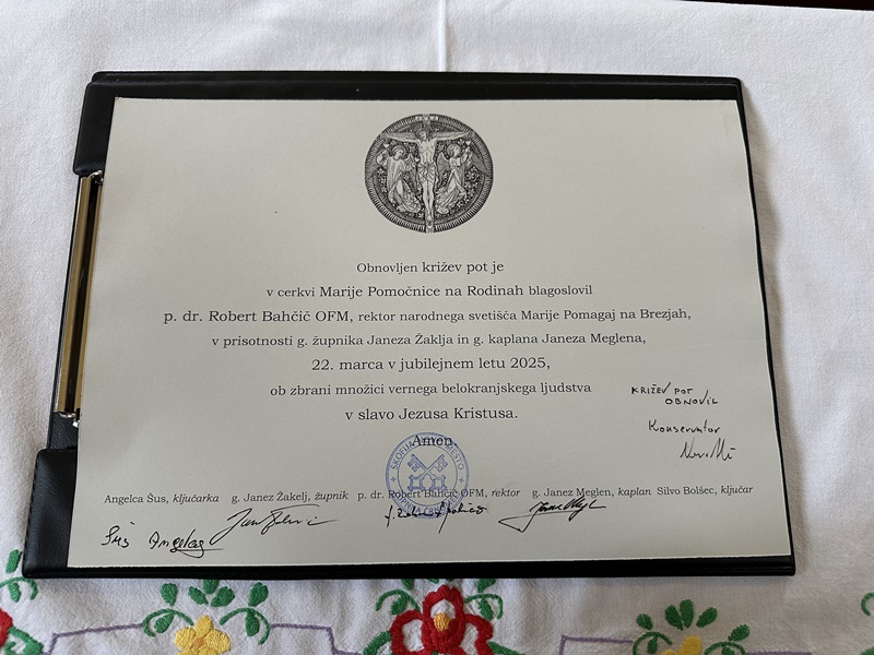Tudi jaz, p. Frančišek Kopitar, duhovnik Reda manjših bratov svetega očeta Frančiška – reformatov, zgoraj imenovani, v trajen spomin potrjujem in izpovedujem, da sem po zaupanem mi naročilu v zgoraj omenjeni cerkvi blažene Device Marije v Rodinah, dne 18. junija leta 1882, po ustaljenem obredu blagoslovil in slovesno postavil Križev pot, z vso tisto oblastjo in veljavo, da bi verniki, ki so v stanju milosti, s pobožnim opravljanjem te pobožnosti lahko prejeli enake odpustke, ki so bili nekoč podeljeni romarjem v svete kraje ali obiskovalcem svetega križevega pota v Jeruzalemu, in jih lahko namenijo sebi ali rajnim.