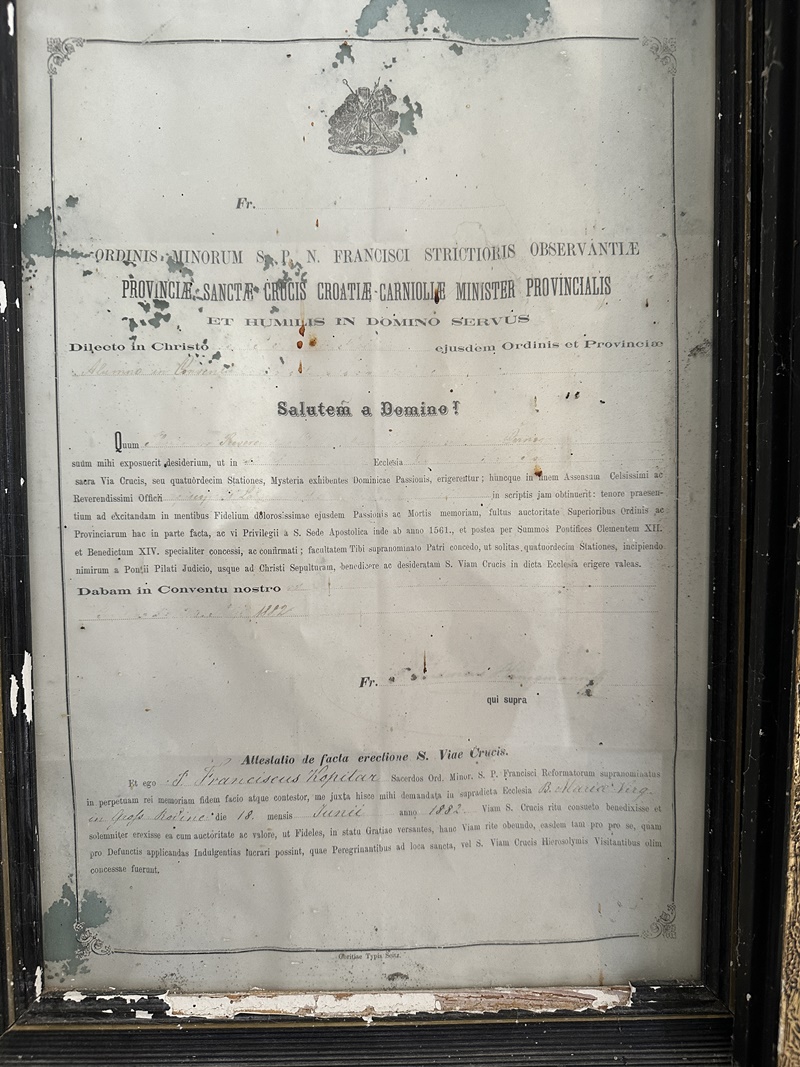 Listina, napisana v latinskem jeziku, o blagoslovu križevega pota dokazuje, da je ob postavitvi, križev pot blagoslovil frančiškan, p. Frančišek Kopitar, iz slovenske frančiškanske province. Prevod je pripravil br. Jan Dominik Bogataj:
