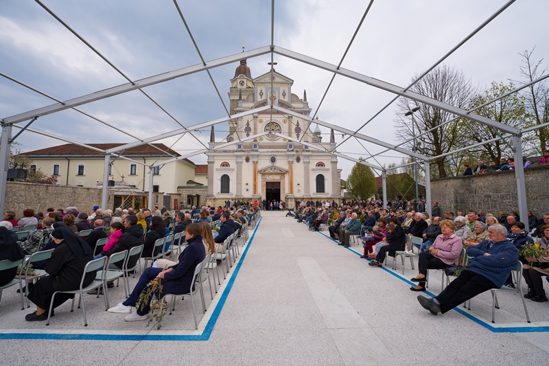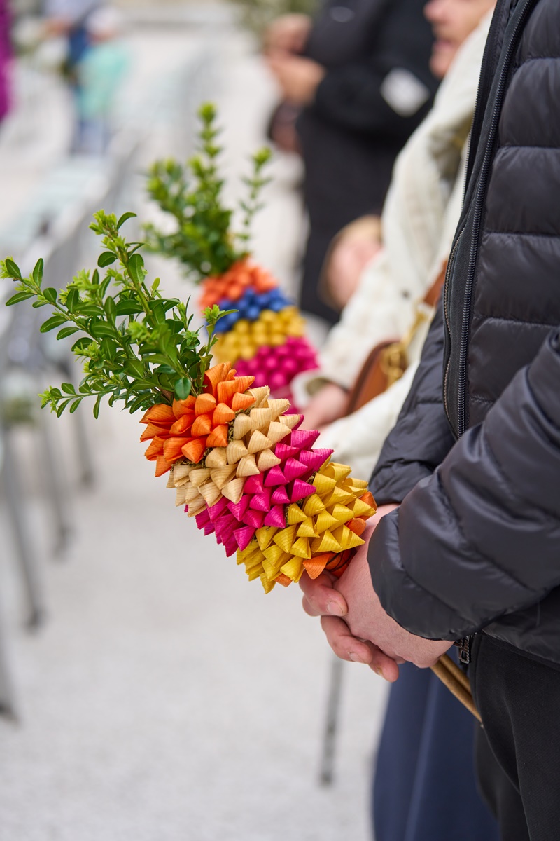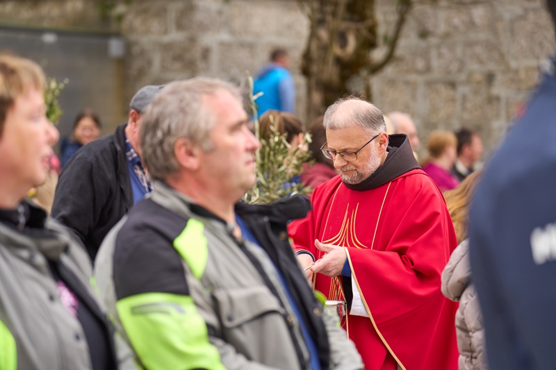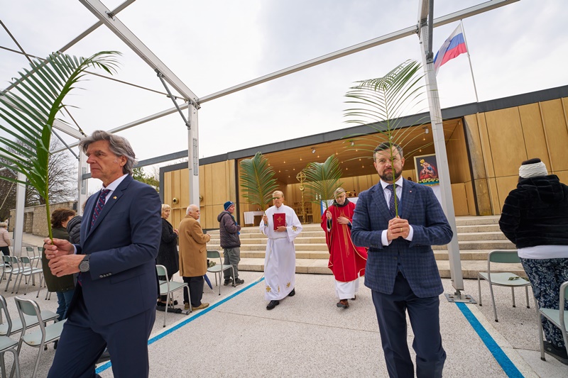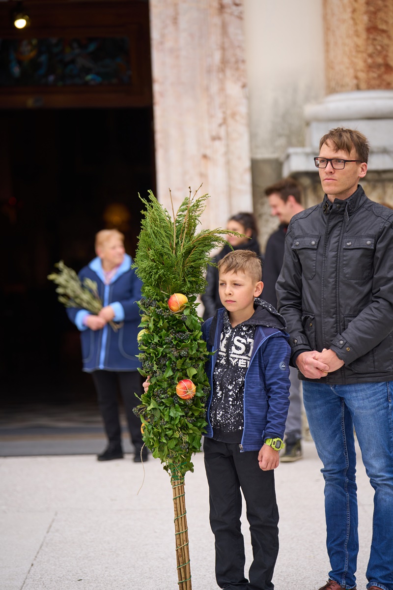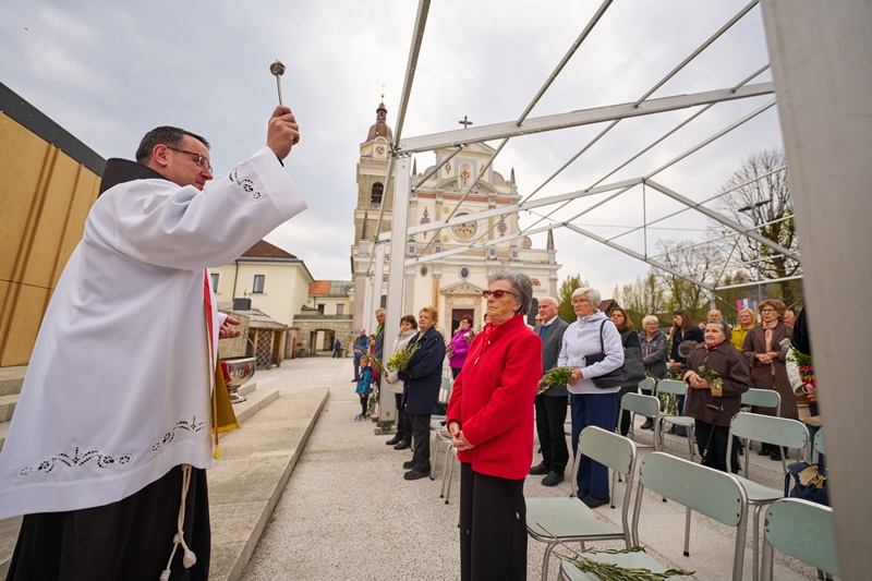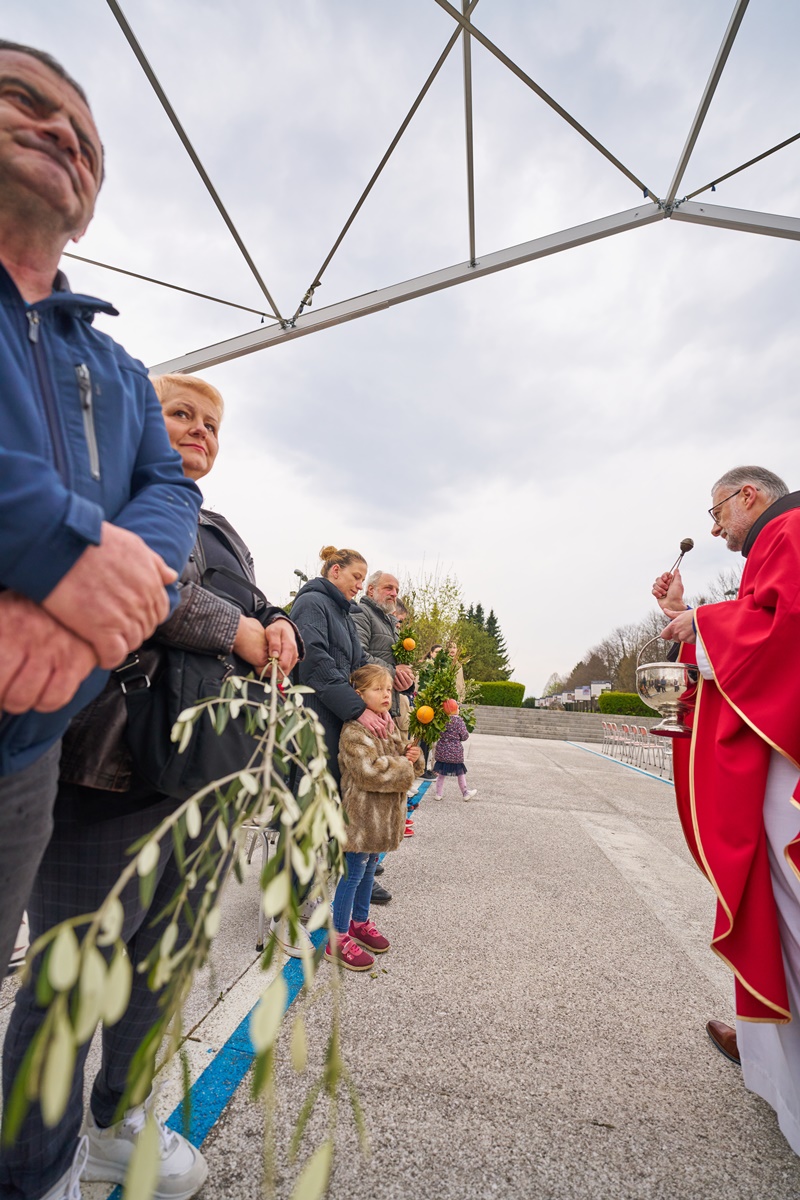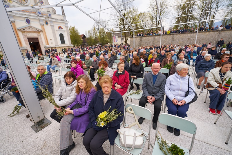 Na Cvetno nedeljo se je pri Mariji Pomagaj zbralo veliko število romarjev. Osrednja romarska sveta maša ob 10. uri je letos prvič potekala na trgu pred baziliko Marije Pomagaj. Daroval jo je rektor svetišča, dr. p. Robert Bahčič. Ob začetku svete maše je blagoslovil zelenje, raznovrstne butarice, begance ter oljke, ki so jih romarji prinesli v blagoslov.