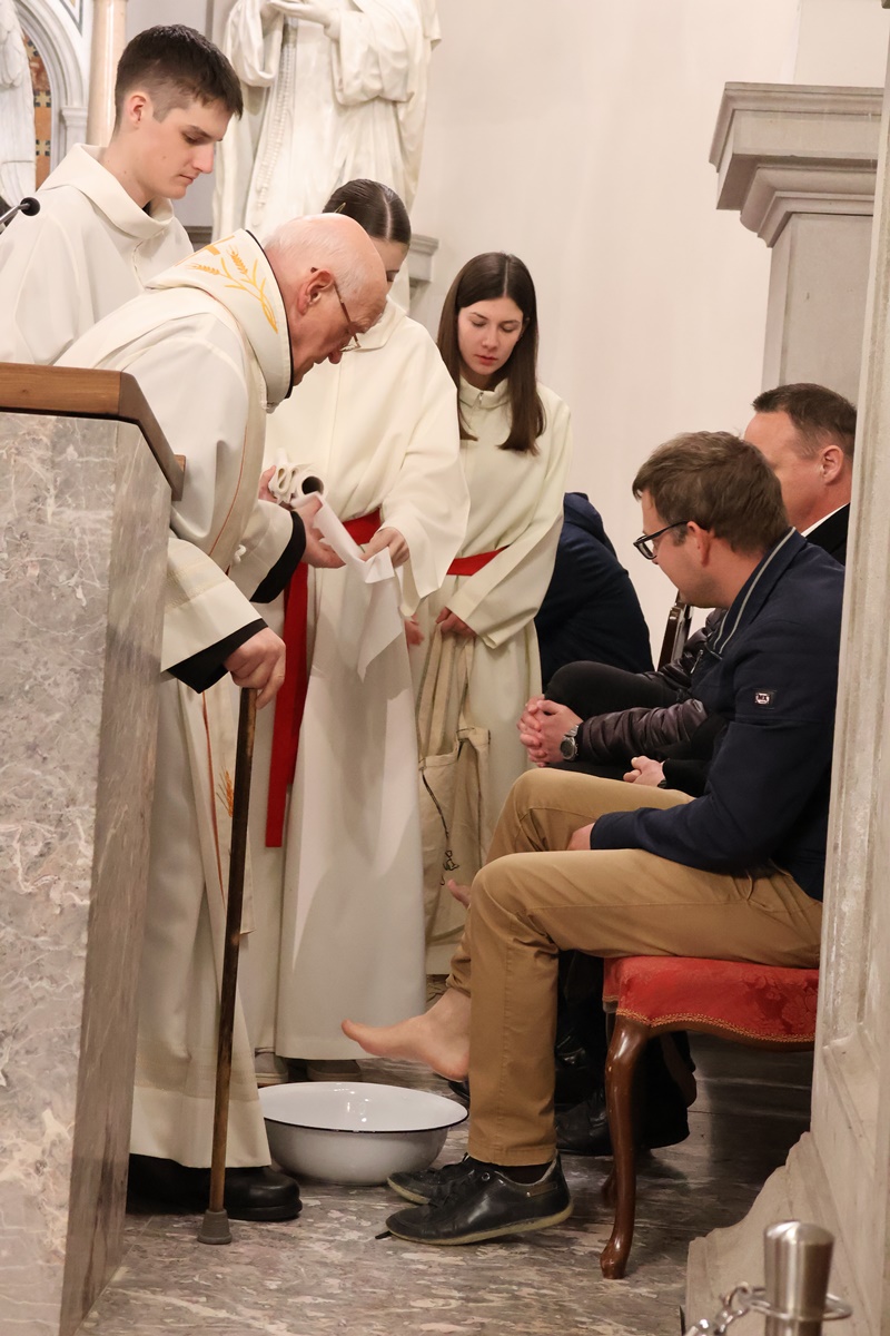 Po pridigi je p. Viktor Papež 12 moškim, ki so predstavljali 12 apostolov, simbolno umil noge. Tako je duhovnik simbolično pokazal, da je kljub dostojanstvu duhovniške službe služabnik zaupanim ljudem.
