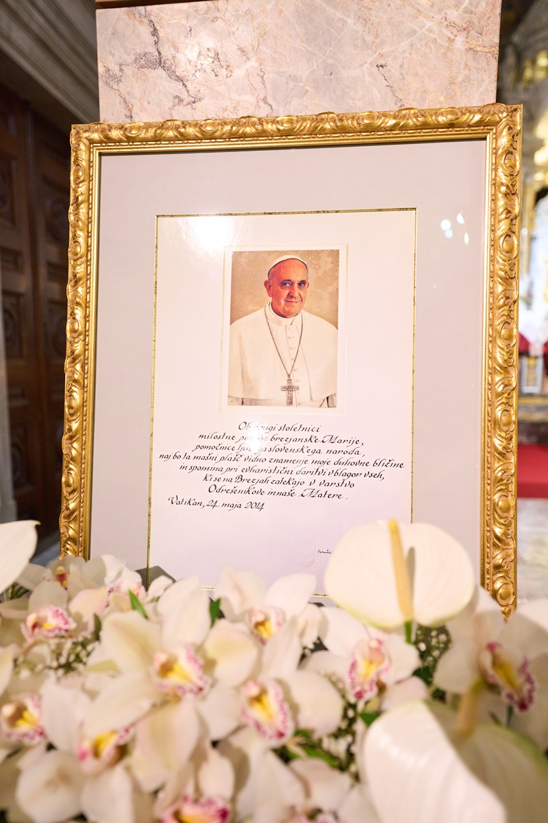 Na poseben način je bil papež Frančišek povezan z Brezjami in Marijo Pomagaj, ko smo obhajali 200-letnico milostne podobe Marije Pomagaj, 24. maja 2014. Za to praznovanje nam je podaril Marijin mašni plašč, v katerem danes mašujem, ter besedilo, ki ga je osebno podpisal. Zapisal je: »Ob drugi stoletnici milostne podobe brezjanske Marije, pomočnice ljubega slovenskega naroda, naj bo ta mašni plašč vidno znamenje moje duhovne bližine in spomina pri evharistični daritvi v blagor vseh, ki se na Brezjah zatekajo v varstvo Odrešenikove in naše Matere. Vatikan, 24. maja 2014. Frančišek.«